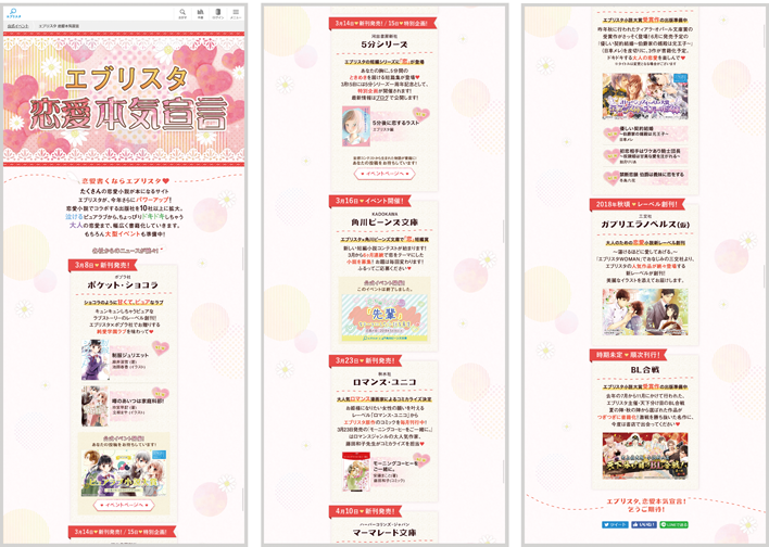 恋愛本気宣言|エブリスタ 恋愛小説でコラボした出版社のランディングページ。各社のイベント情報を掲載 イベントページへの導線は既存のタイマー設定を参考に、終了時にはリンク削除等を組み込む 担当フェーズ:コーディング markup
